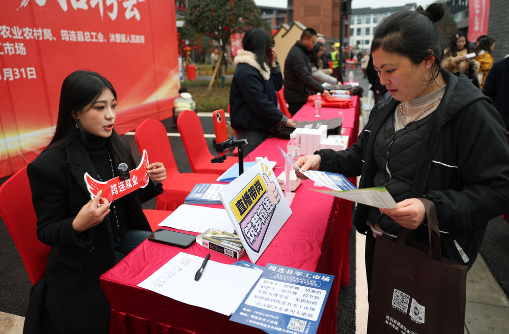 近日,一场专场招聘会和直播带岗活动在四川省宜宾市筠连县沐爱镇金坪村新居文化广场进行,10余家企业为村民带来280个就业岗位。新华社记者 江宏景 摄